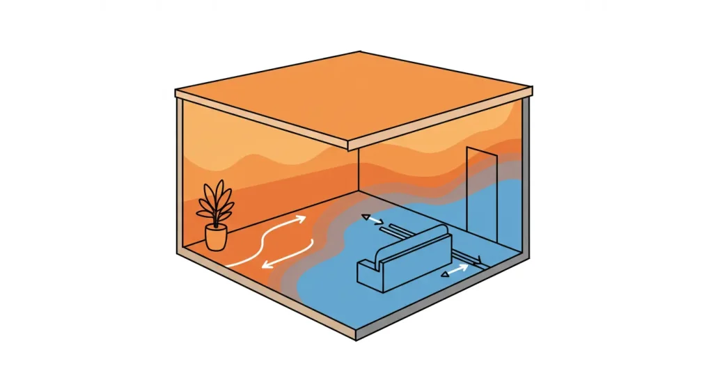 この結果、天井と床では大きな温度差が生まれ、「頭は暖かいのに足は寒い」という状況を引き起こします。さらに、壁に設置されたサーモスタットは床の本当の温度を感知できず、足元の寒さを解消しようと設定温度を上げすぎてしまうため、無駄なエネルギー消費にも繋がってしまいます。