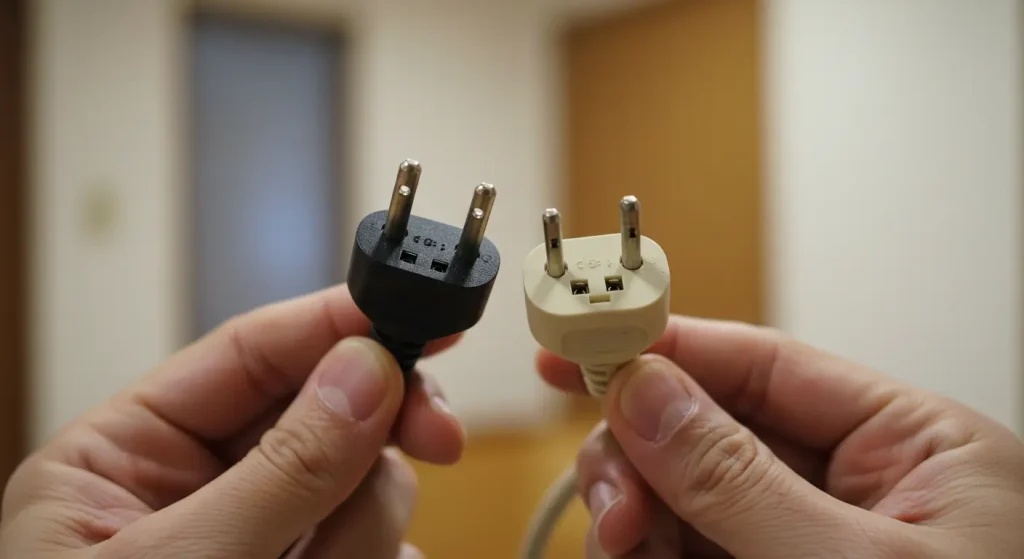 まずは、こたつヒーター本体から電源コードを一度引き抜いてみましょう。そして、コードの差込口の穴がいくつあるか、あるいはヒーター本体側のピンが何本あるかを数えてください。