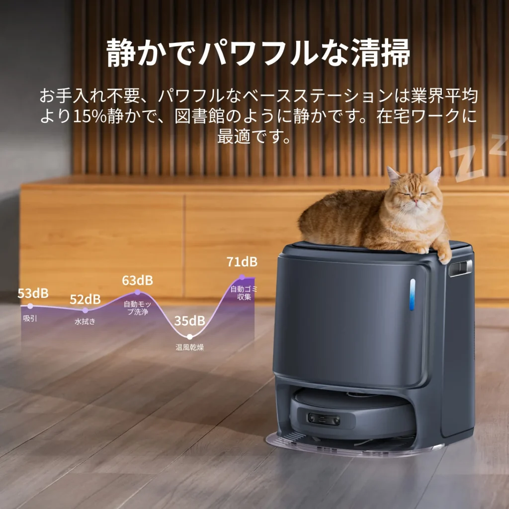 一般的な全自動ロボット掃除機は、掃除終了後にベースステーションへ戻り、爆音(ジェットエンジンのような70〜80dB程度の音)を立ててゴミを吸い上げますが、Freo X Ultraはこのプロセスを根本から見直しました。
