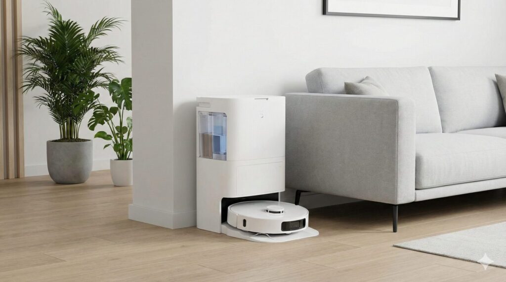 まず、本体とステーションのサイズ感です。汚水と浄水のタンクを内蔵しているため、ステーションにはある程度の高さと奥行きが必要です。また、Lidarセンサーを搭載しているモデルは本体の高さが約10.7cmほどあり、一部の低い家具(脚の短いソファやベッドなど)の下には入り込めない可能性があります。数センチの差が入れるかどうかの分かれ道になるため、事前の計測は必須です。