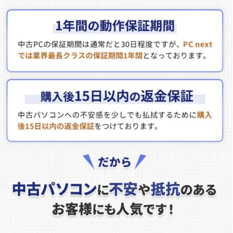 さらに、PC nextは商品到着から15日以内であれば理由を問わず返品を受け付ける「15日間返金保証」というサービスも提供しています。