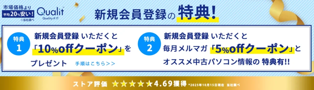 Qualitでお得に買い物をするなら、クーポンの活用は必須です。まず、初めて利用する方は「新規会員登録」を行うことで、すぐに使える10%OFFクーポンがもらえます。パソコンは数万円の買い物になるため、10%の割引は数千円単位の節約になり、非常に大きいです。