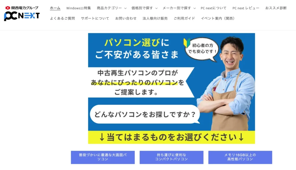 PC nextは、関西電力グループが運営するショップで、その圧倒的な信頼性の高さが最大の特徴です。市場に溢れる低スペックな中古PCを排除し、「本当に快適に使えるパソコン」だけを厳選して販売しています。