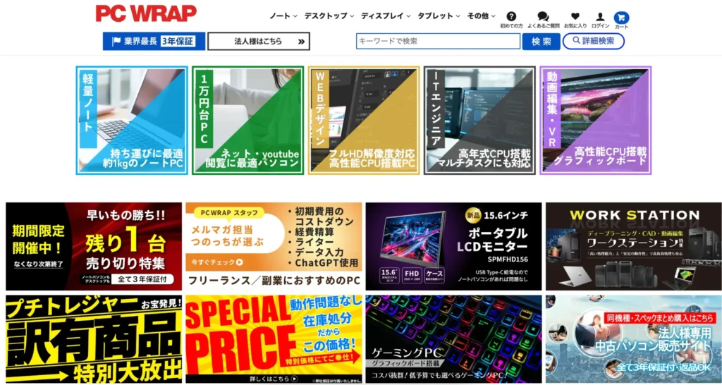 PC WRAPは、業界でも異例の「3年保証」を提供している老舗ショップです。「中古パソコン買うならどこ?」と迷っている初心者の方に、まずおすすめしたい最もリスクの低い選択肢と言えるでしょう。