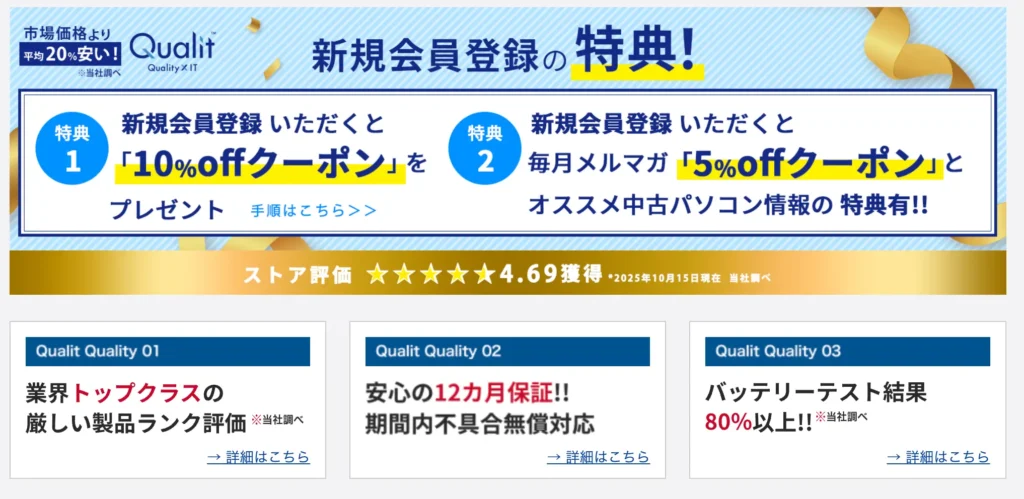 Qualit(クオリット)は、IT機器レンタル大手の「横河レンタ・リース」が運営するショップです。自社で法人レンタルしていたPCの返却品(リースアップ品)を直接販売しているため、素性がはっきりしており、品質の高さには定評があります。