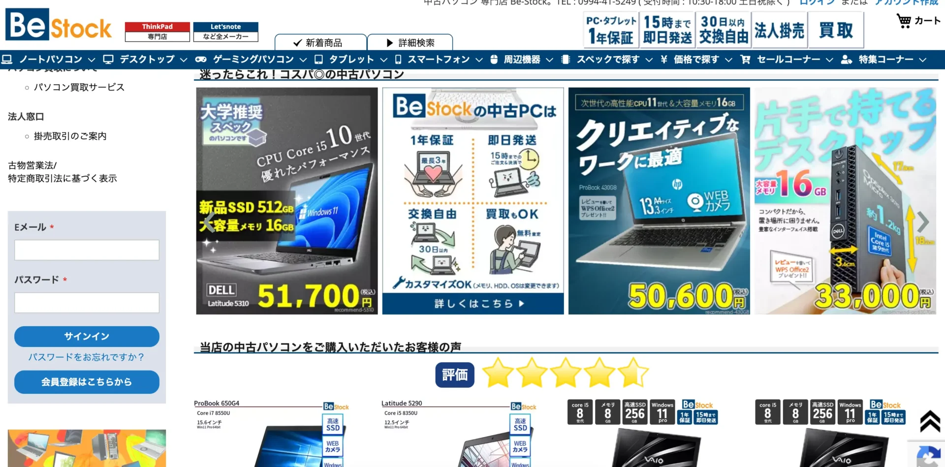 Be-Stockは、ThinkPadなどのビジネス向けノートPCに強い専門店です。創業から25年以上の歴史を持ち、PC中級者〜上級者から特に支持されています。「吊るし」の状態だけでなく、自分好みにカスタマイズできる点が大きな魅力です。